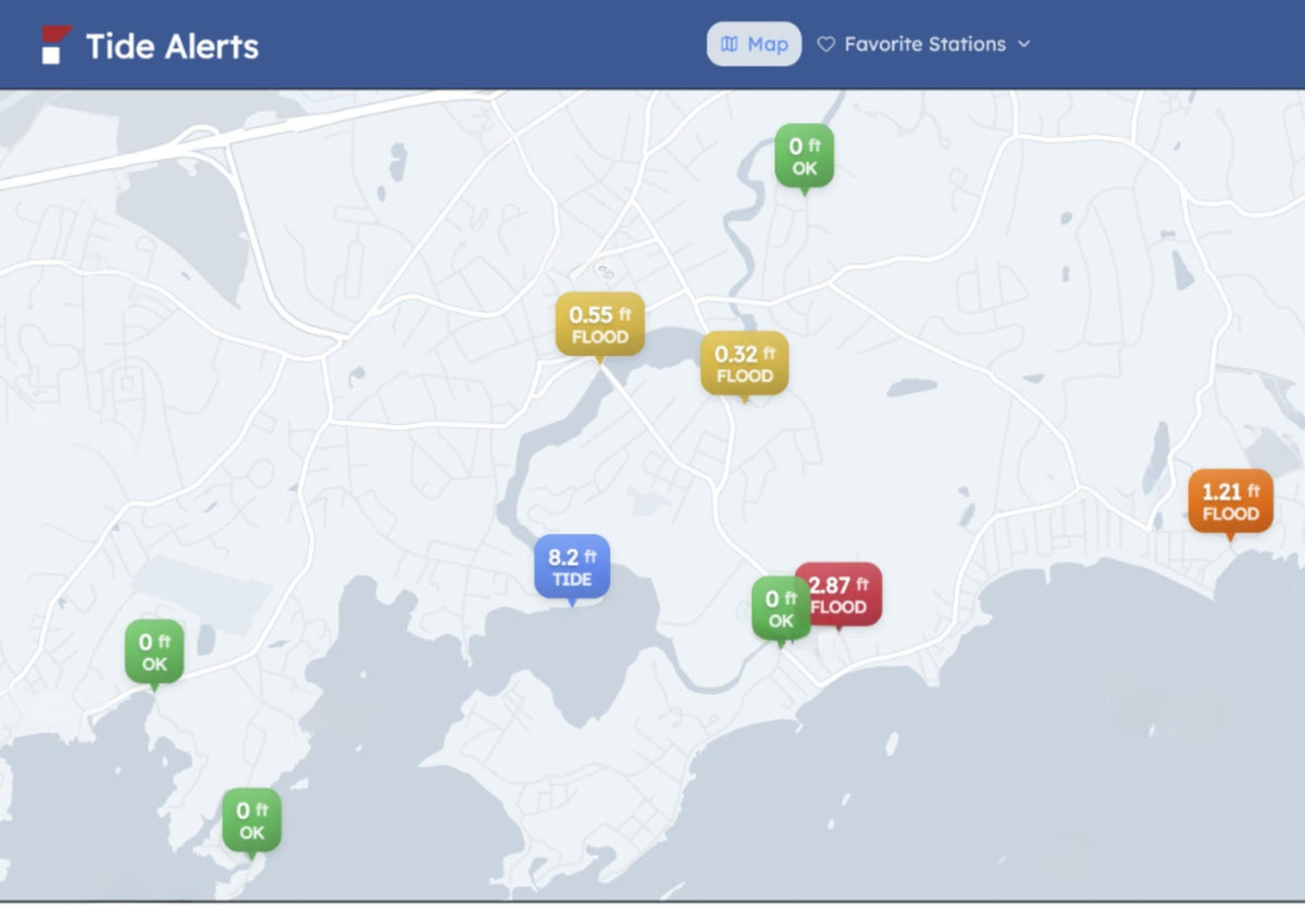 Sentient Things offers an integrated tide and flood monitoring system for cities and towns. The Tide Alerts web application for cities and towns provides real-time flood levels for emergency management as well as water level and surge data that may be used for coastal surge and flood mitigation. The locations of tide or river gauges and land-based flood gauges is displayed on a map with the flood gauge water levels color coded and labeled to show the level of the flood. Clicking on a particular station shows a chart of flood or tide levels over time. Water levels may be displayed relative to ground level, the tidal mean-lower-low-water or relative to NAVD88 which is the datum used by NOAA and FEMA for flood mapping.
