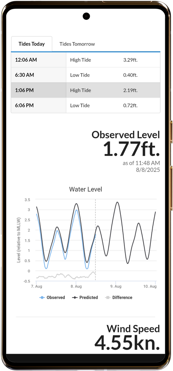 The free Tide Alerts™ Web App brings live water‑level data and NOAA‑technique‑based tidal forecasts right to your fingertips. Accessible from any smartphone, tablet, or computer, it provides a complete, real‑time picture of local conditions.